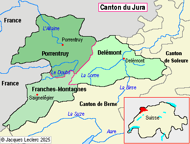 Le canton du Jura (JU) — officiellement République et canton du Jura — fait partie des quatre cantons francophones unilingues (avec Vaud, Neuchâtel et Genève) de la Confédération suisse. Il est situé au nord-ouest de la Suisse près de la frontière française. Au sud, se trouvent les cantons de Neuchâtel et de Berne, à l'est ceux de Soleure et de Bâle-Campagne. De l'autre côté de la frontière suisse, on trouve les départements français du Doubs, du Territoire de Belfort (région Franche-Comté) et du Haut-Rhin (région Alsace). Le Jura est un petit canton de 838 km² par comparaison à celui de Berne (5959 km²) ou de Vaud (3212 km²). La capitale du canton est Delémont. Sa frontière avec la France est longue de 121 kilomètres et de 111 kilomètres avec les cantons voisins de Bâle-Campagne, de Soleure, de Berne et de Neuchâtel. |