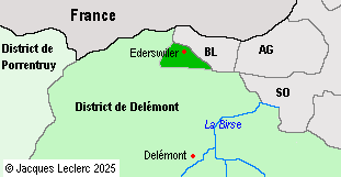 La commune d'Ederswiler (environ 120 habitants) dans le district de Delémont est une petite commune du canton du Jura située au nord près de la frontière française et mitoyenne avec le canton de Bâle-Campagne (BL, en allemand : Basel-Landschaft). Ederswiler fut rattachée en 1815 au canton de Berne, mais le passage de cette partie du canton de Berne le 1er janvier 1979 au canton du Jura nouvellement créé eut pour effet de maintenir le village dans le canton du Jura. Aujourd'hui, c'est l'unique commune germanophone du canton, puisque 85 % de sa population est de langue maternelle suisse allemande. En raison de sa proximité avec la France (à 3,2 km de la frontière), une part importante de la population comprend le français qui est enseigné aux enfants dans la commune voisine de Movelier. |