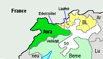 Toutefois, ce n'était pas tout à fait encore terminé! Après une longue procédure, le district alémanique de Laufen (en jaune sur la carte ci-contre) rejoignit le canton de Bâle-Campagne (BL : Basel-Landschaft en allemand) en 1994 et la commune de Vellerat (ancien nom allemand: Weiler) quitta le canton de Berne le 1er juillet 1996 pour devenir la 83e commune jurassienne. En 1996, on trouvait 77 électeurs dans le village d'Ederswiler, dont 35 avaient voté pour la création du canon du Jura (c'étaient les catholiques), tandis que 42, les protestants, avaient voté pour rester bernois et bernoises. Ederswiler dut demeurer dans le canton du Jura parce qu'il n'avait pas de frontière commune avec le canton de Bâle-Campagne. |