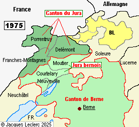 Lors d'un de ces référendums dont la Suisse a le secret, la population suisse approuva majoritairement la création du nouveau canton. Cependant, certaines communes du Jura bernois, pourtant francophones, refusèrent d'entrer dans le nouveau canton et préférèrent rester dans le canton de Berne, prospère et surtout protestant comme elles; ce n'est pas tant l'appât du gain que la religion qui les a retenus. À la suite d'une procédure unique (consultation du 23 juin 1974), le Jura fut en 1975 divisé en deux: la moitié septentrionale (districts de Delémont, de Porrentruy et des Franches-Montagnes) obtint le statut de «canton autonome», alors que la moitié méridionale demeura rattachée au canton de Berne (districts de Courtelary, de Moutier et de La Neuveville) sous le nom de Jura bernois. Le 20 mars 1977, le peuple jurassien approuva la Constitution par plus de 80 % des votants. La Constituante l'avait elle-même approuvée à l'unanimité, le 3 février 1977 dans la collégiale catholique romaine de Saint-Ursanne (un monastère du XIe siècle). Le 24 septembre 1978, la population suisse et tous les cantons acceptèrent la création officielle de la «République et canton du Jura» au sein de la Confédération suisse. Le nouveau canton fut créé le 1er janvier 1979 et fut constitué de trois districts: Delémont, Porrentruy et Franches-Montagnes. |