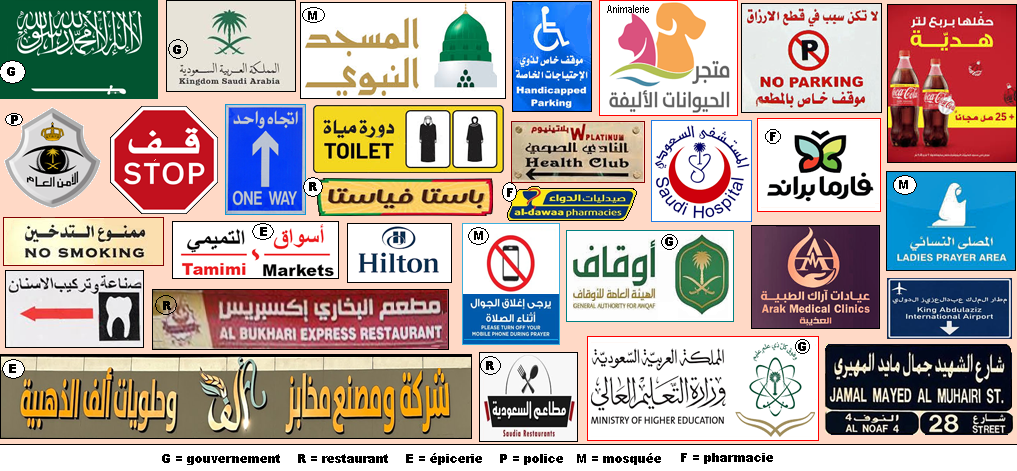 Lorsqu'on consulte la figure ci-dessus, on constate qu'il existe des inscriptions unilingues arabes et des inscriptions bilingues arabes-anglaises, la seule inscription unilingue anglaise étant le Hilton. Il ne semble pas y avoir de règle, car les inscriptions unilingues anglaises concernent la police, une animalerie, le coca-cola, une pharmacie, un restaurant, une épicerie et un dentiste.