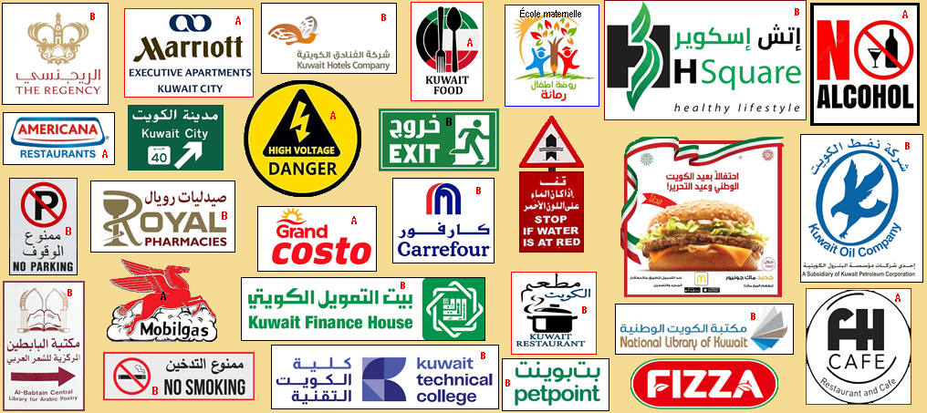 De façon générale, on peut croire qu'il s'agit d'un pays bilingue, ce qui n'est pas le cas juridiquement (de jure), mais effectivement dans les faits (de facto). Les seules affiches unilingues arabes sont le nom d'une école maternelle et la publicité de McDonald's pour les hamburgers. Toutes les autres affiches sont bilingues ou uniquement en anglais (Marriott, Danger, Mobilgas, Fizza, FH Cafe, No Alcool, Grand Costo, Americana Restaurants, Kuwait Food).