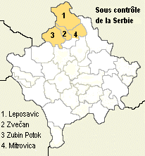 constitution le 15 juin 2008, le mandat de la MINUK fut considérablement modifié en profondeur, de même que sa configuration, et son effectif a été réduit en conséquence. Tout sépare les deux parties de la ville : au nord, le dinar serbe sert de monnaie, au sud c'est l'euro. Au nord règne l'alphabet cyrillique et le serbe; au sud, c'est l'alphabet latin et l'albanais. Il y a deux mairies, dont l'une est reconnue par Belgrade, l'autre par Pristina.